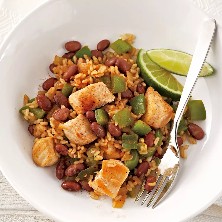 Fiber-rich red beans, whole-grain brown rice and skillet-cooked chicken breast are ready in just...